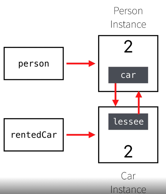 이러한 형식으로 instance가 서로 강한 참조로 묶여있어 person과 rentedCar을 nil로 참조를 끊어 Reference Count를